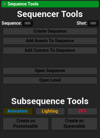 Note2: The possessable and spawnable create buttons work on the open sequence and not on the sequence referenced with the sequence and shot inputs.