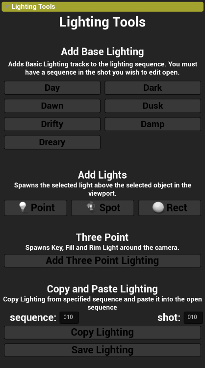 This will copy and paste the lighting from one sequence to another. To use this tool you would need to have the scene that you want to copy the lighting into, and then input the sequence and shot into the appropriate fields of the shot that you want to copy the lighting from.There is also a save lighting button which will need to be pressed after the lighting has been copied to the new shot.